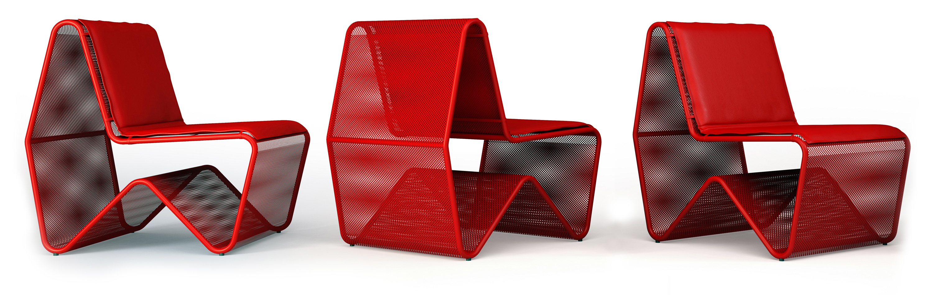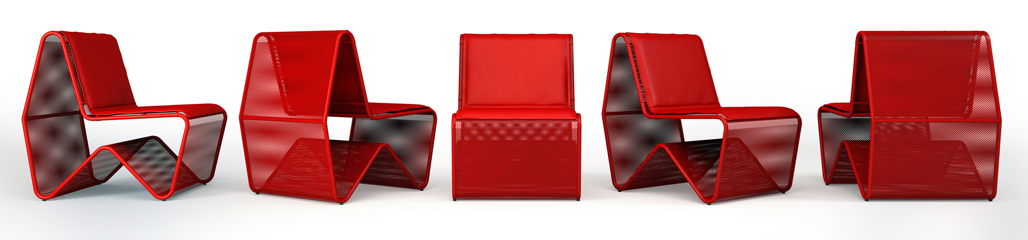 Esta peça busca o uso de materiais não tão convencionais para uma poltrona, como o metal e a chapa de aço perfurada, para o assento e encosto uma almofada fina de densidade alta é usada para trazer o conforto necessário.