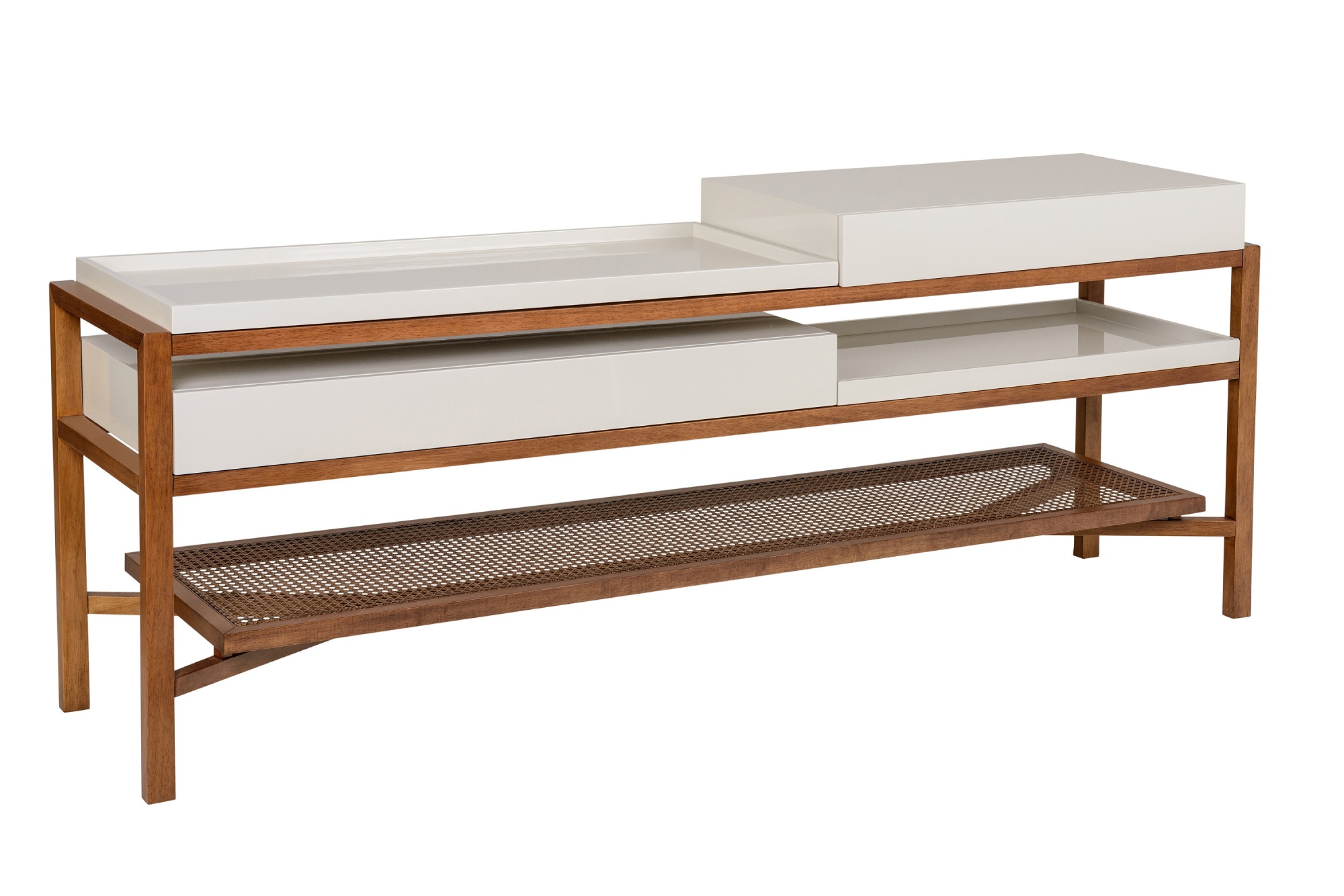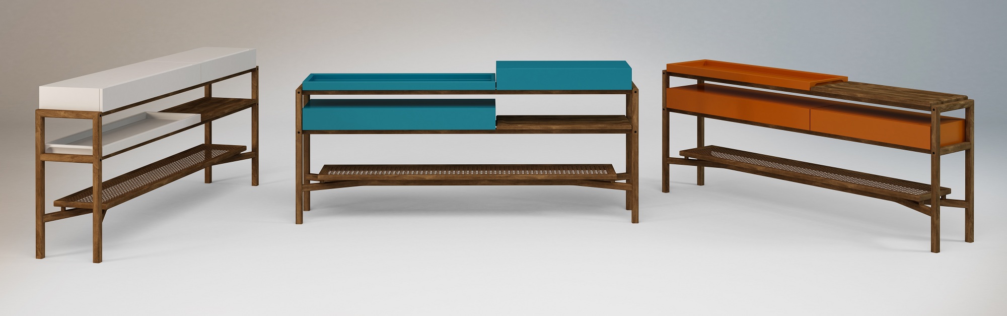 O aparador busca ser versátil e personalizável, as estruturas de gavetas são encaixadas, assim como as bandejas, podendo a peça ficar mais alta, usando as gavetas em cima; mais despojada, com uma disposição alternativa, e estilo bar com a bandeja e prateleira na parte superior. Há uma prateleira inferior em palha, que é presa a estrutura com um espaçador, que faz com que ela pareça flutuar os pés. A estrutura da madeira é relativamente simples, tem por base ripas, fixadas por cavilhas ou espigas e parafusos. Os módulos de gavetas e bandejas são encaixados e levam um feltro na parte inferior para que o atrito não danifique a peça.