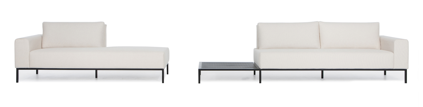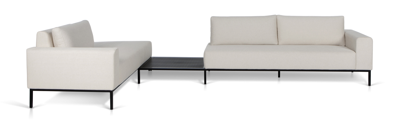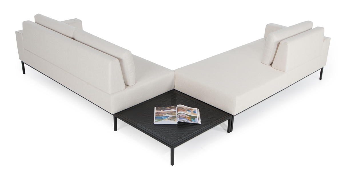 Composto por dois itens o sofá duo possibilita diversas composições, podendo atender a diferentes espaços e necessidades, com arremates estilo envelope as almofadas tem uma estética limpa que preza pelo detalhe, a estrutura em metal com detalhes em tela de metal perfurada ou mármore arrematam o traço da peça.