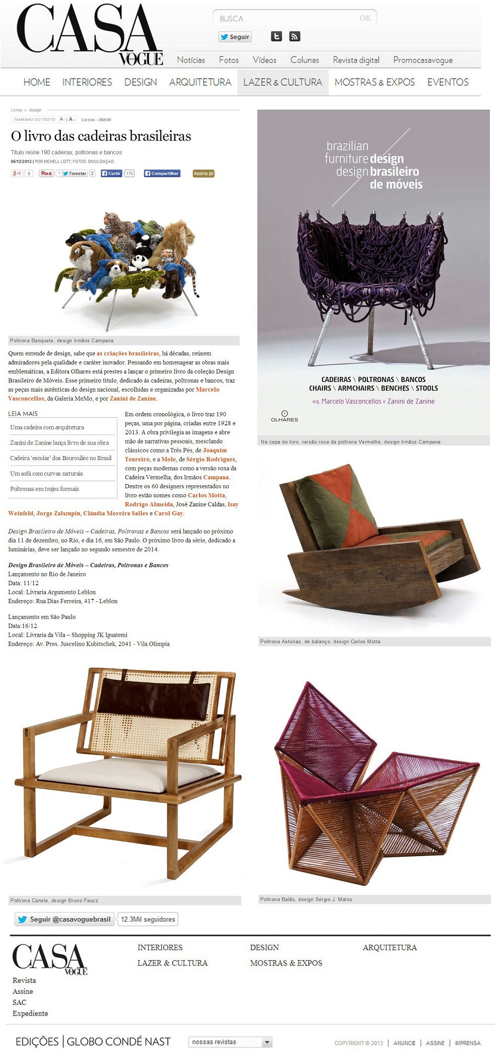 Divulgação site Casa Vogue, destaca poltrona Canela – Livro Design Brasileiro de Móveis – Cadeiras, Poltronas e Bancos. Editora Olhares, 2013.